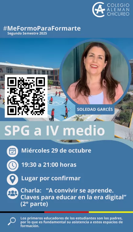El miércoles 27 de agosto, se realizó la primera charla de Soledad Garcés, dirigida a apoderados desde Spielgruppe hasta IV Medio, centrada en el uso de tecnologías y su impacto en el bienestar emocional de niños, niñas y adolescentes.
